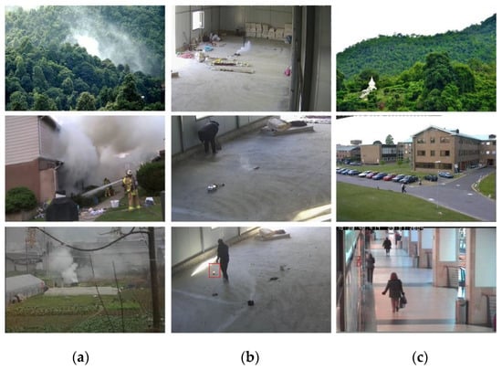 Dataset. (a) The smoke images were downloaded from the internet; (b) The small and thin images were created in a warehouse; (c) The non-smoke images were downloaded from the internet.