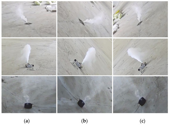 As shown in Figure 6, the smoke in the first photo of a column of small smoke of Figure 6 is from the smoke generator, the second photo from a smoke sheet, third photo from cotton rope. A total of 120 videos were collected, and the videos are divided into three types of smoke, namely the smoke from the smoke generator, the smoking sheet, and the cotton rope. The small and thin smoke dataset is unique. Because the small and light smoke images within 100 × 100 pixels from the high-definition video screenshots of 1080 × 1920 pixels were screened out, the smoke of the smoke generator is relatively uniform. Its smoking principle is to use the manual button to smoke, and the difficulty of smoke detection is relatively simple compared with the other two types of smoke. The smoke emitted by the cotton rope and the smoking sheet after burning will not be so obvious. Its initial smoke and smoke are relatively small, equivalent to the smoke of indoor objects that do note easily cause fires. Moreover, the smoke of cotton rope is particularly small, which is in line with the requirements of small and thin smoke in the early stage of fire.