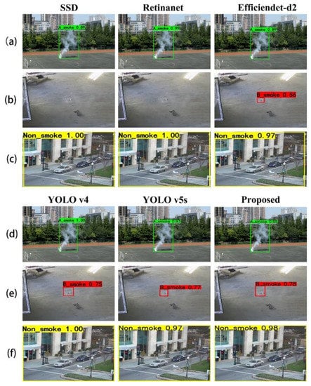 Figure 8 shows the effect of the proposed model and different contrasting models in smoke detection. In order to ensure fairness, the detection effects of the same image in each category in the dataset for comparison were selected. From the result, the proposed model has better detection performance.
