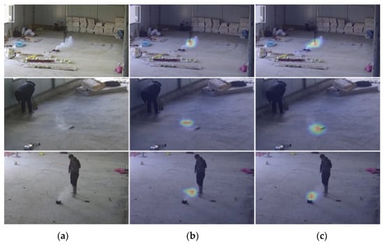 In Figure 9, heatmaps of different small smoke in self-created dataset are compared. The column in (a) represents the original image, the column in (b) represents the heatmap without attention mechanism added, and the column in (c) represents the heatmap with attention added. Considering the situation, after adding attention, the focus on small smoke will be closer to the source of the smoke. This effect is consistent with the expectation that more attention will lead to the accelerated discovery of the source of the smoke in the early stage of the fire to prevent the fire from spreading.