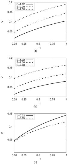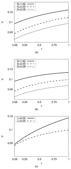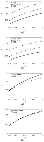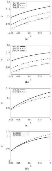 We refer again to Table 1 and Table 3. As with European and American vanilla call/put options, the value of European and American CI call/put options increase/decrease with the underlying price S and all options increase with time-to-expiry . In all cases, the increase in installment rate L decreases the option value. This is to be expected, as payments of installments should make the initial premium lower. Hence, the larger L is, the lower the initial premium. See Figure 1, Figure 2, Figure 3 and Figure 4. Note that in Table 3, we used a different value of for the American CI put option so as to demonstrate the corresponding behavior of the exercise boundary (Table 4) in that case. However, the values with are plotted in Figure 4a–d to compare with the European case.
