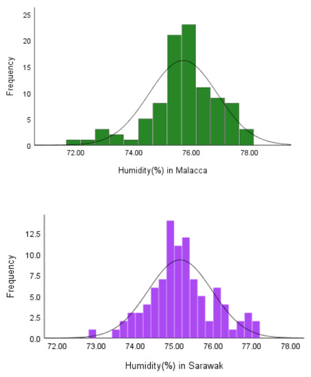 The applicability of the proposed technique in real situations is studied. For this purpose, we analyze a dataset containing two features: The humidity (%) and the scale of mouth, foot and hand disease outbreak from 2010 until 2017 for two regions in Malaysia (Sarawak and Malacca). Details about the datasets can be found in [34,35]. Table 6 and Figure 5 report the descriptive statistics and histograms of the features. The results show that the CVs of the humidity in Sarawak and Malacca are 0.8872 and 1.0788, respectively. The CVs of the disease outbreak in Sarawak and Malacca are 0.0107 and 0.0159, respectively.