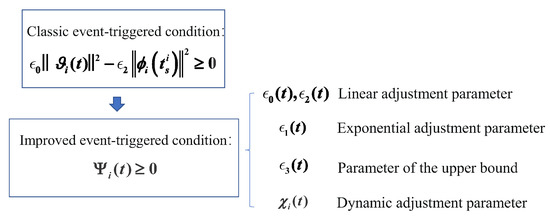 - Triggering Condition (4) is a generalized form covering situations in many other studies [25,26,27]. The trigger in the improved sampled-data event-triggered scheme was extended to be accelerated or decelerated linearly and exponentially, which increases the flexibility of the triggering scheme.