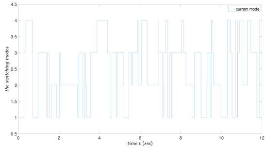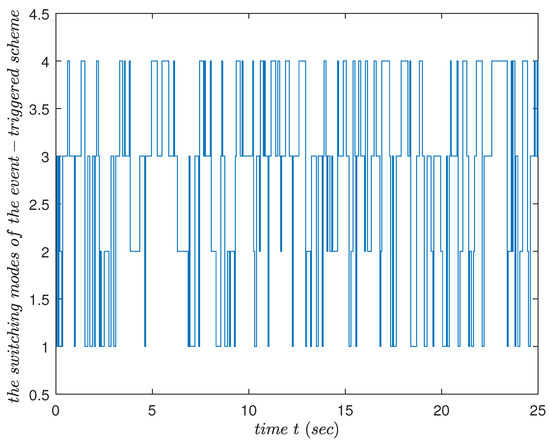 Case 2: As become , respectively, where is the Markov switching function described as [28,29], the triggering condition changed into the switching mode form. That is, were able to be in the different mode based on shown in Figure 2, causing the switching condition to be in different working modes. At this point, if the system also contains switching modes, and triggering conditions can be well-matched with the system’s modes.