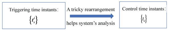 where matrices and are the controller gains that need to be determined. Matrices and stand for the interference signal of controller gain (ISCG). , obeying Bernoulli distribution, denotes the stochastic variable that is used to simulate the random occurrence of interference signals. If ISCG occurs, ; otherwise, . Constant ı represents time delays occurring in the transmission of signals. The triggering time instants are reordered into the time instants of the controller, which can improve the degree of freedom of triggering conditions and the performance analysis of dynamical systems due to the weakening of triggering time instants (See Figure 3).