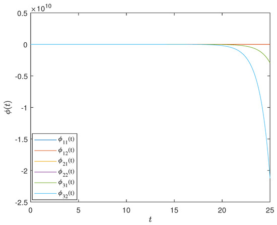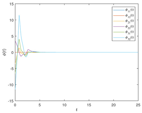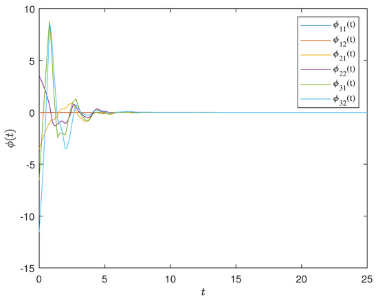Here, the state of each node belongs to , . Taking , , , ====1 and . , . Utilizing the LMI toolbox in MATLAB, the corresponding control gain matrix was obtained as shown in Equation (47).