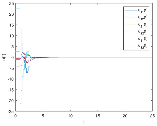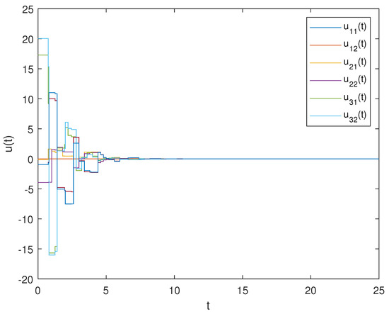 The control time instants were set to be . Further, time instants were introduced to rewrite System (3) as System (7) in compact form. The control input of node i is shown below: