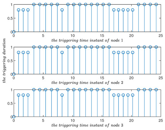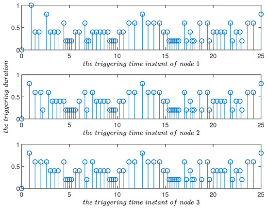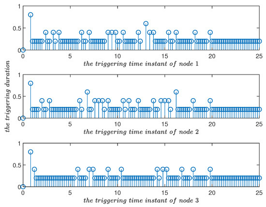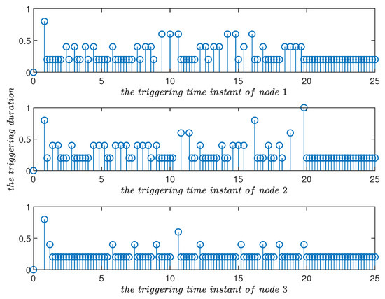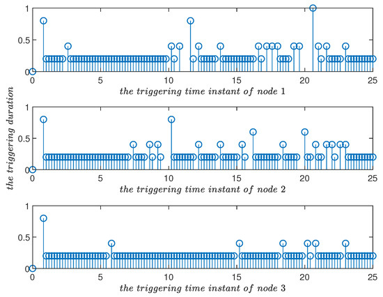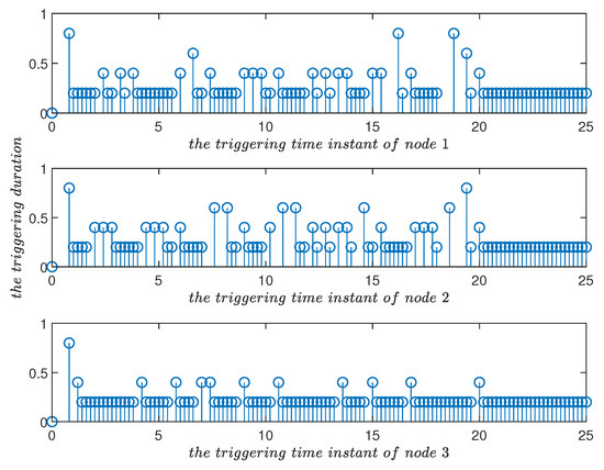 Triggering time instants and their duration in the improved event-triggered scheme for in Example 1. Compared with Figure 10, it can be seen that the triggering parameter played a role in adjusting the triggering frequency.