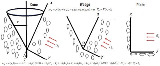 Here, an incompressible, laminar, bioconvective, electrically conducting fluid is considered over nonhomogeneous geometries (, , ). Let the direction of flow be in the direction of the -axis, where the -axis is orthogonal to it. A uniform magnetic field acting normal to the surface shown in Figure 1. Let the cone or wedge half angle be denoted as , the wedge full angle as , and the cone radius as . The whole physical system is then subjected to the non-Fourier heat flux model. The concentration and temperature close to the surface are taken as and , respectively. are the ambient temperature and concentrations, respectively. Heat radiation, chemical reaction, thermophoresis, and Brownian motion impressions are considered, while the magnetic field and viscous degeneracy impressions are discarded. Raju et al. [26], Amit and Shalini [28] and Atul Kumar et al. [27].