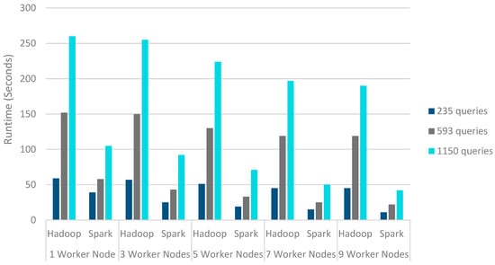 Run-time (Seconds) of Hadoop and Spark with the change in number of queries.