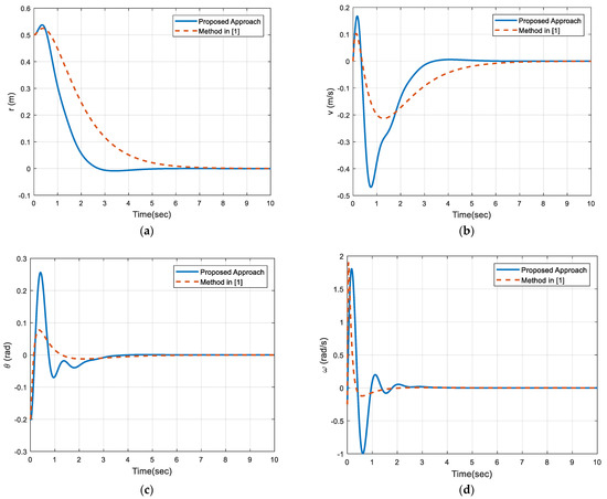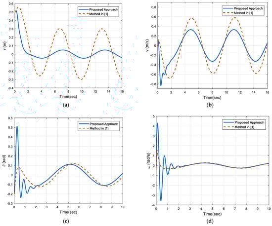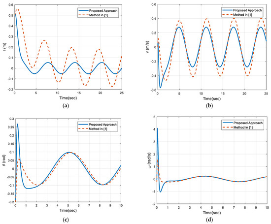 (a) State trajectoriy of a nominal nonlinear system (indicating the suggested approach’s stabilizing efficiency in comparison to the method applied in [1]). (b) State trajectoriy of a nominal nonlinear system (indicating the suggested approach’s stabilizing efficiency in comparison to the method applied in [1]). (c) State trajectory of a nominal nonlinear system (indicating the suggested approach’s stabilizing efficiency in comparison to the method applied in [1]). (d) State trajectory of a nominal nonlinear system (indicating the suggested approach’s stabilizing efficiency in comparison to the method applied in [1]).