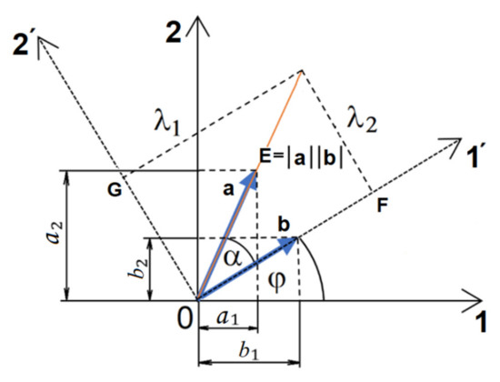 In the symmetric matrix case, it is necessary to verify transformational properties that guarantee the Frobenius norm value’s immutability. Eigenvalues , which constitute legs of a right triangle in the coordinate system, may be determined for any chosen symmetric matrix. The eigenvalues ratio may be expressed by the tangent of the angle , subtended between the vector and the positive part of the axis x