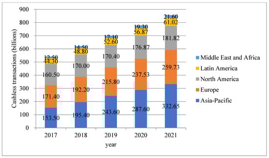 With the development of financial technology (FinTech), technology-driven financial innovation in the fields of payment, settlement, deposit, and loans, cashless payments have broken the restrictions of traditional payment and have become the most convenient payment method [,]. Cashless payments refer to the settlement of payment for goods by means other than cash, including bills, credit cards, electronic settlement, and so on. It enables consumers to pay more conveniently, safely, and accessibly, and has been accepted by most countries worldwide []. Based on the statistics from the People’s Bank of China, in 2021, a total of 439.51 billion cashless payments were handled, with an amount of 4415.56 trillion yuan. Compared to the same period in 2020, the two figures increased by 23.90% and 10.03%, respectively. Similarly, according to the statistics of the Federal Reserve, cashless payment transactions in the United States account for about 80% of all transactions in 2021, with a year-on-year growth rate of more than 14%. Globally, according to Capgemini’s Global Payments Report 2021, cash payment volumes fell nearly 16% in 2020, creating the highest rate of decline in the past decade. Figure 1 shows the increasing trend of cashless transactions.