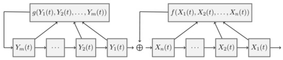 FSR, as a finite state automaton that can be represented by difference equations of a set of Boolean functions, in addition to its application in stream ciphers, is also widely used in communication systems, digital circuits and other fields [1,2,3]. The research of FSRs has a history of more than 50 years. In 1967, the famous scholar Golomb [4] introduced the fundamental characteristics of FSRs and the generation mechanism of the shift sequences, and these two concepts serve as the foundation for FSR study today. Different from linear FSR (LFSR), nonlinear FSR (NFSR) has received more attention due to its higher level of security. In stream ciphers, NFSR, as a generator of pseudo-random sequences, has been researched by numerous scholars. Especially after the European eSTREAM project, many NFSR-based stream cipher algorithms emerged, such as the hardware finalists Grain [5], Trivium [6], and Mickey [7]. In convolutional codes, NFSR is the main building block of decoding algorithms such as threshold decoding [8,9]. In the threshold decoding algorithm, the syndrome sequence formed by the received information symbols and the received supervisory symbols is used as the input of the NFSR, and the output of the NFSR is used as the error estimation, so that the correct information symbols can be obtained.