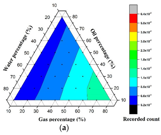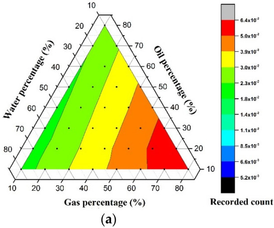 The configuration of the detection system proposed in this investigation is simulated by the MCNP code [28]. In recent years, the use of this platform for simulating radiation-based systems has been greatly appreciated by researchers [29,30,31,32]. The detection system consists of a dual-energy source, a steel test pipe, and two sodium iodide detectors. The gamma sources include 241Am and 133Ba radioisotopes. The test pipe used for simulating the three-phase flow in the stratified regime as well as the deposited scale has an inner diameter of 10 cm and a thickness of 0.5 cm. Two 2.54 cm × 2.54 cm detectors were located at a distance of 30 cm from the source in such a way that one of them was exactly in front of the source and the other was at an angle of 7° to the hypothetical line between the source and the first detector. As mentioned, three-phase flow was simulated in a stratified regime consisting of water, oil, and gas in volume percentages between 10% and 80%. Barium sulfate (BaSO4), which has a density of 4.5 g·cm−3, was used to simulate the scale at thicknesses of 0, 0.05, 1, 1.5, 2, 2.5, and 3 cm inside a cylindrical pipe. The water, oil, and gas considered in this simulation had densities of 1, 0.826, and 0.00125 g·cm−3. The structure simulated in this study was validated with the experimental structure implemented in [1]. A two-phase flow was performed in the annular regime, and the same structure was implemented in the MCNP code. The registered counts obtained from the detectors of the simulation structure and the experimental structure were compared with each other. It was observed that there is an acceptable match between the two. Seven scale thicknesses × 36 different volume percentages = 252 simulations were performed. From each simulation, four characteristics, named the Photopeaks of 241Am and 133Ba for the first and second detectors, were extracted; in total, a matrix of 4 × 252 was obtained for neural network training. The desired output of this research was the thickness of the scale inside the pipe. The simulated configuration is depicted in Figure 1. Figure 2 and Figure 3 show ternary surface plots related to the count under the Photopeaks of 241Am and 133Ba in the second detector for various combined gas, oil, and water volume fractions at the thickness scales of 0 and 1.5 cm, respectively. As can be observed from the comparison of these two figures, with an increase in the thickness of the scale, the count recorded by the detectors decreases, which can be an important factor in distinguishing the selected characteristics. The graph of extracted characteristics in terms of scale thickness in constant volume percentage (10% gas, 40% oil, and 50% water) is shown in Figure 4.