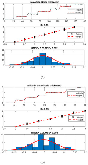 In order to show the correct performance of the neural network, three fitting, regression, and error histogram graphs were plotted for three categories: training, validation and testing data (Figure 6). In the fitting diagram, the desired output is shown with a red dashed line and the network output is shown with a black line. In the second diagram, the desired output is visible as a red dashed line, and the outputs of the neural network is visible as black squares. This diagram is presented as a regression diagram. The horizontal axis in this diagram shows the data number, and the vertical axis shows the thickness of the scale. The histogram diagram shows the value of error distribution; the distribution of this value is around the zero number, indicating the low error value of the designed network. Table 1 shows the characteristics and errors of the designed neural network. Table 2 shows a comparison in terms of the amount of error in the designed detection system with the systems introduced in previous research. The general process of the presented methodology to determine the thickness of the scale inside the pipe can be seen in Figure 7. According to this figure, in the first stage of the configuration of the system, the flows passing through the pipe and the different thicknesses of the scale inside the pipe were simulated by the MCNP code, and the signals received by the detectors were labeled. Then, the received signals were processed and four characteristics of the Photopeaks of 241Am and 133Ba for the first and second detectors were extracted from the signals of each simulation. The characteristics obtained were assigned as inputs of the MLP neural network to estimate the scale thickness within the pipe. After training the neural network, in order to ensure correct functioning of this network, the output results of the network were compared with the desired output.
