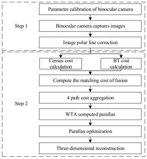 It can be seen from Figure 1 that the 3D reconstruction algorithm of a binocular vision sole with improved matching cost has two main steps. The first step is to build a binocular vision system, use the Zhang calibration method to obtain camera parameters, and collect sole images for polar line correction. The second step is to perform stereo matching on the image. The specific steps are as follows: First, the algorithm combining BT and Census costs is used to calculate the matching cost, and the 4-path aggregation strategy is used to aggregate the cost. The obtained disparity is then post-processed using the WTA algorithm to select the final matching cost. Finally, according to the calibrated camera parameters, 3D reconstruction of the sole is performed.