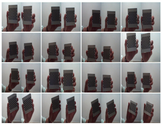 Firstly, the experimental platform of the binocular camera is built, and the Zhang calibration method is used for joint calibration. In order to ensure the accuracy of the calibration parameters, an alumina calibration plate with a side length of 5 mm is used for each small square. A total of 24 pairs of calibration images are collected, and image pairs with large errors are removed. For example, samples with large calibration offsets need to be removed. Sixteen samples are used to calibrate the image, and the calibration picture is shown in Figure 2.