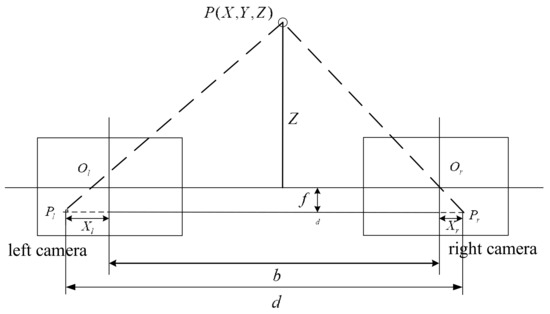 Where represents the target point to be measured, and its coordinate is . and are the optical centers of the left and right cameras, respectively. is the corresponding projection point of the target point on the left image plane, and its coordinate is . is the corresponding projection point of the target point on the right image plane, and its coordinate is . is the deviation between the two positions, called parallax. is the distance between the optical center plane and the image plane, called the focal length. is the baseline distance. is the distance from point to the plane of the optical center, called the object distance. It can be seen from Figure 3 that: