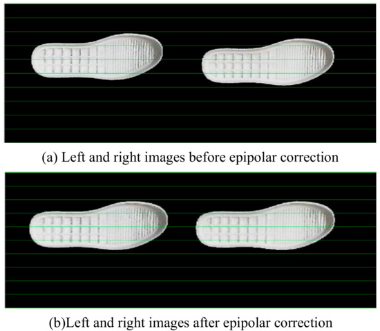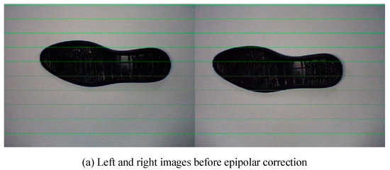 For the convenience of observing the changes before and after the epipolar correction, equidistant horizontal straight lines are added to the figure. It can be seen from Figure 4 that the points on the edge of the sole are already at the same level after the epipolar correction.