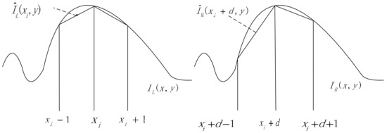 BT cost is similar to SAD cost. Both are calculated using the absolute value of the grayscale difference in the pixels, but the BT cost also performs half-pixel interpolation on the two pixels. Taking the horizontal direction as an example, its schematic diagram is shown in Figure 5.