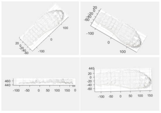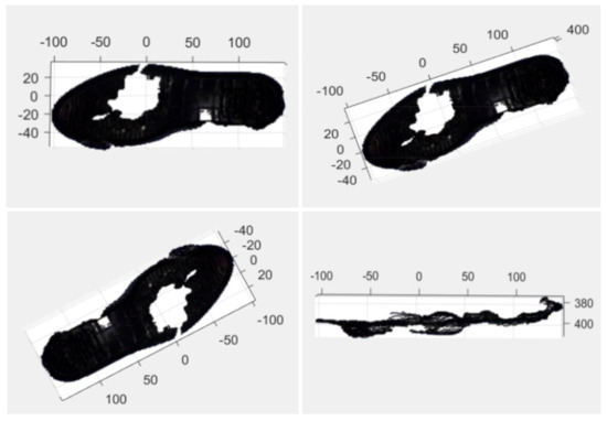 It can be seen from Figure 9 that the soles reconstructed based on the improved matching cost algorithm retain the details better. The traditional method is prone to the phenomenon of missing details. The point cloud has an obvious layering phenomenon, and the contours of the obtained toe and heel remain intact. There is still some noise due to background distractions. According to the difference between the color of the sole and the background, the obtained point cloud image is filtered to remove the black noise. The result obtained is shown in the Figure 10: