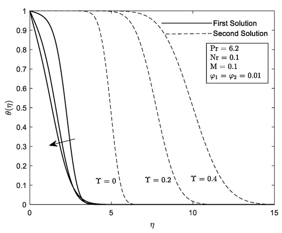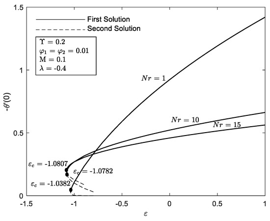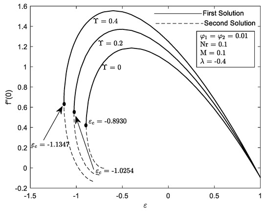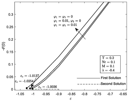 Figure 6 and Figure 7 illustrate the influence of different values of with the velocity parameter ε. It can be seen that a dual solution occurs when the governing parameter is inserted. The dual solution appears when the region is shrunk . The hybrid nanofluid seems to accelerate the boundary layer’s separation at the flat plat quicker in comparison to when and . Moreover, the presence of causes the widening of the range solution and increasing of and . Additionally, the increment of curvature parameter by means decreasing the radius of the cylinder. Therefore, more particles can fit into the cylinder surface area offering greater resistance to the particles of the fluid. Thus, boost up the heat transfer. These results are supported by Figure 12 and Figure 13. Consequently, come to a consensus with the aforementioned [22] that the performance of heat transfer is enhanced provided that the value of increases.