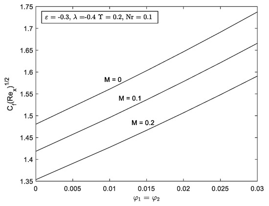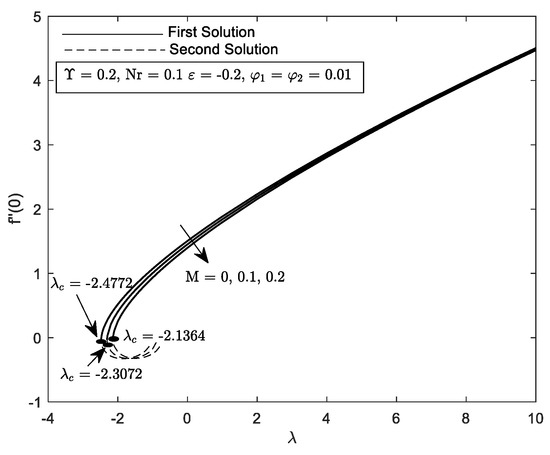 Figure 4 and Figure 5 exhibit the and variation with respect to mixed convection parameter, for multiple values of M. It is noticed that the range of solution deteriorating as M is prominent in the flow for both graphs. The denotes the detachment between the first and second solution, which may be seemed in the opposing flow . Furthermore, the increment of M fastens the separation of boundary layer flow, i.e., and This figure was supported by Figure 10 and Figure 11, where the value of and were reduced as the strength of M increased. As a result of the increase of M, there will be more resistance and a drag force known as the Lorentz force. In turn, this force might lessen heat transfer and skin friction by opposing and slowing the hybrid nanofluid’s velocity. On top of that, it is important to note that the increment in concentration of hybrid nanofluid increased the value of and . Basically, the strong interaction between the hydromagnetic and the concentrated nanoparticles in the fluid led the fluid to be gradually dragged in the direction of the nanoparticle’s motion, consequently increasing both and .