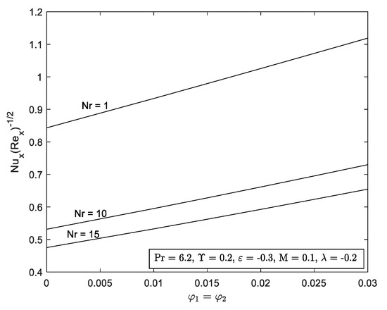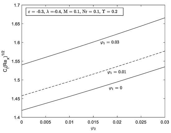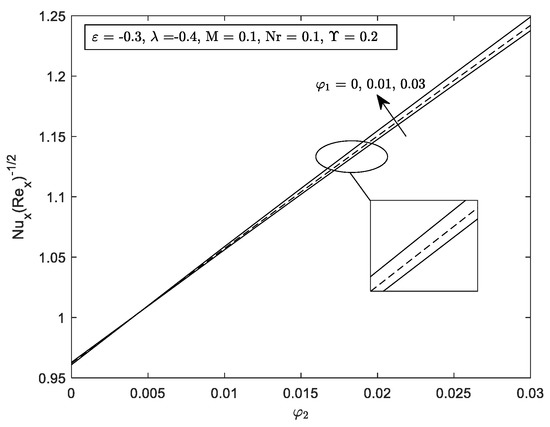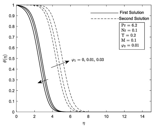 In this study, two parameters are set to be fixed, and . While the other governing parameters such as , , and vary for further computation. Graph for local skin friction, and local Nusselt number, are highlighted in Figure 10, Figure 11, Figure 12, Figure 13, Figure 14, Figure 15 and Figure 17. Profiles for velocity, and temperature, are pictorial in Figure 18, Figure 19, Figure 20, Figure 21, Figure 22, Figure 23, Figure 24, Figure 25 and Figure 26. Since the thermophysical properties equations relate with the different volume of nanoparticles, hence the range for the thermophysical properties values are: and .