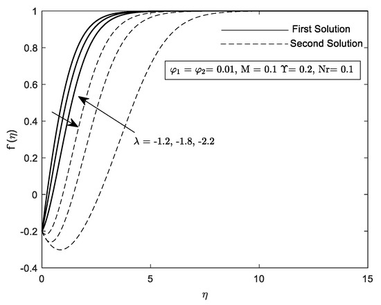 Different concentration of and are selected to illustrate three behavior of the fluid, for instance, (viscous fluid), (SWCNT/water nanofluid) as well as (SWCNT-MWCNT/water hybrid nanofluid) are plotted in Figure 2 and Figure 3. The graphs clearly show that the range of solution widens as the volume concentration of nanoparticles is added. Moreover, the hybrid nanofluid assist in delaying the detachment of the first and second solutions for and , when by means that the opposite movement between the hybrid carbon nanotubes and the plate, respectively where , and .