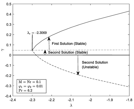 In dealing with the boundary layer flow problem, we might deal with possibility of having zero, unique, multiple, or even ghost solution(s) [61,62,63,64] under some boundary conditions. Commonly, the solution that initially satisfies the far field boundary condition is designated as the first solution for case of multiple solutions (non-unique). Numerous researchers [65,66,67,68] showed that the first solution is stable and reliable solution. However, [69] testified that in certain existence problems, second solution is stable. Due to this, a stability analysis is important to validate the reliability of the solutions. With respect to [70], a temporal stability analysis is discovered. Three vital steps are performed to identify the solutions’ stability. First, by inaugurating a new dimensionless parameter, with a new set of similarity variables in terms of and . Second, we implement the linear eigenvalues equations. Third, to attain the range of possible eigenvalues, the BCs need to be relaxed.