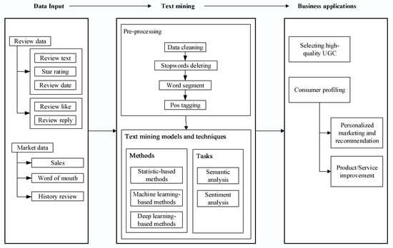 Refining these studies will help to extract more valuable information from UGC to support production practices. According to the results of the thematic analysis of the literature, some of these studies focus on the design and optimization of text mining techniques, especially semantic mining and sentiment analysis. Some focus on the practical application of these techniques, such as review quality evaluation based on content characteristics, as well as consumer profiling, preference analysis, product design, and recommendation. Furthermore, some studies organically combine text mining technologies and applications of to solve specific practice problems. The main contents of this paper were determined according to the thematic analysis. Because these articles generally take UGC as the data source, we discuss the text mining of UGC from three perspectives: data input, text mining techniques, and their business applications.