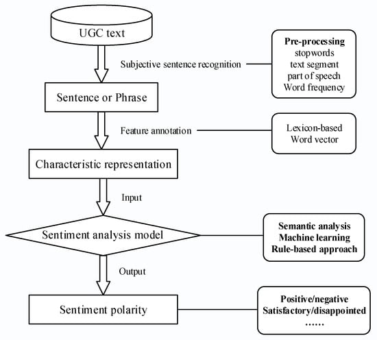 Sentiment analysis and opinion mining, which are often used interchangeably, focus on systematically identifying, extracting, and quantifying people’s affective states and subjective information from written text [39]. User sentiment in UGC comprises attitudes toward products or services and indicates the degree to which requirements are satisfied [40,41]. Sentiment analysis in the field of text mining is based on sentiment words in text, which are the fundamental basis for judging users’ attitudes [42,43] and analyzing the voice of the consumer for applications that range from consumer research to marketing and product development. Research on sentiment analysis can be divided into coarse-grained (document-level and sentence-level) sentiment analysis [44] and fine-grained (feature-level) sentiment analysis [10,45]. In UGC analysis, the former refers to mining the emotional attitude of the whole UGC text, whereas the latter identifies a user’s emotion toward product features or target topics in a more granular manner [36,46]. Figure 3 illustrates the common flow of sentiment analysis for UGC.