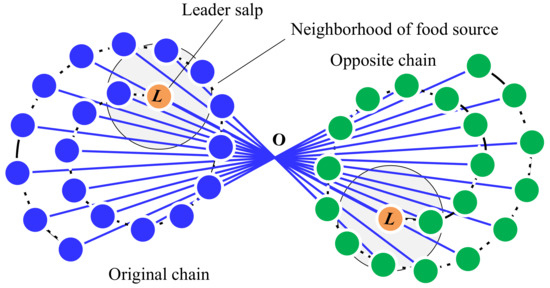 In the proposed OSMSSA, the initialization is instigated by creating a set of random salps X of size N, in which the salp , . Then, OBL is utilized to attain the opposite pair for each salp. Hence, the opposite chain is generated. Regarding two chains X and , the fittest N salps are selected based on the fitness values. Figure 3 shows the opposite pairs on two chains. In the OSMSSA, the OBL is used based on the modified formula described in Equation (25):