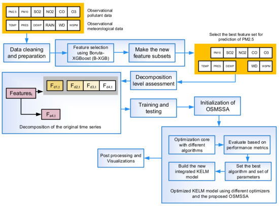 The new contributions of this research are as follows. This research introduces a new efficient kernel extreme learning machine model (WD-OSMSSA-KELM model) based on B-XGB feature selection and an enhanced multi-strategy variation of the salp swarm algorithm (SSA) and wavelet decomposition to increase the accuracy of PM2.5 prediction findings. To begin, we used B-XGB feature selection to determine the best characteristics for forecasting hourly PM2.5 concentrations and remove redundant features. Then, to reduce the prediction error caused by time series data, we used the wavelet decomposition (WD) technique to achieve multi-scale decomposition results and single-branch reconstruction of PM2.5 concentrations. In the subsequent steps, we optimized the parameters of the KELM model for each regenerated component using the proposed OSMSSA versus other competitive peers. An enhanced version of the SSA with multiple exploratory and exploitative trends was developed to achieve higher performance for the basic SSA optimization and avoid local stagnation concerns. This paper presents novel procedures based on oppositional-based learning and simplex-based search to address the fundamental flaws of traditional SSA. Furthermore, we used a time-varying parameter instead of the SSA’s primary parameter. We suggest utilizing random leaders to drive the swarm towards new parts of the feature space based on a conditional framework to increase the SSA’s exploration tendencies. The developed model was assessed using data from the Beijing Municipal Environmental Monitoring Center’s hourly database, six key air pollutants, and six significant meteorological components.