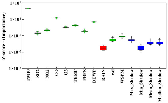 The Boruta method was proposed by Kursa and Rudnicki [62], as a wrapper feature selection technique to determine the most relevant features required for effective prediction and to construct the ML model using the most important features of the dataset. The XGBoost technique can be used as the base algorithm for Boruta, and the suggested method is called the B-XGB algorithm. This method uses a modified variant of the BorutaPy Python module to work with XGBoost. The B-XGB technique has the ability to detect the most-important predictor variables using the Z-scores of each input predictor for the duplicate (shadow) property. We can obtain the Z-score as in the rule in Equation (13).