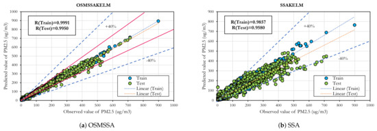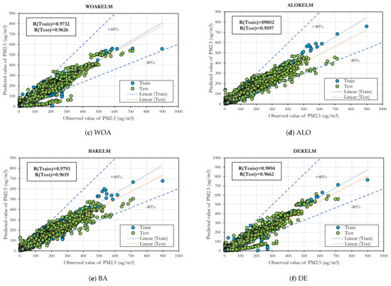 Many researchers have utilized artificial intelligence (AI) paradigms to overcome this disadvantage [16]. For example, in the work by Banga et al. [17], the performance of the extra tree, decision tree, XGBoost, random forest, Light GBM, and AdaBoost regression models was compared for predicting PM2.5 in five cities in China. The artificial intelligence algorithms can handle complicated nonlinear relationships between the involved pollutants and meteorological features and significantly boost the PM2.5 prediction accuracy [18]. Some of the effective models are ELM and KELM, which have been validated in many prediction fields; for instance, they were optimized by the biogeography-based optimizer (BBO) and BBOKELM utilized by Li and Li [19] to estimate ultra-short-term wind speed in various places. In another research work, cuckoo-search-based ELM was trained for PM10 data of Beijing and Harbin in China, and the results confirmed that the optimization method has a positive impact on the performance of the ELM technique [20].