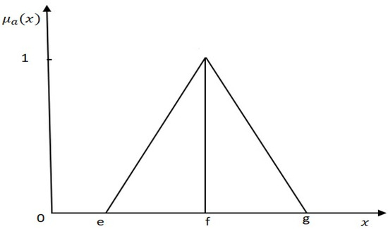 A triangular fuzzy number (as shown in Figure 1) is defined as a ternary number (e, f, g), and its membership function is as follows [2]: