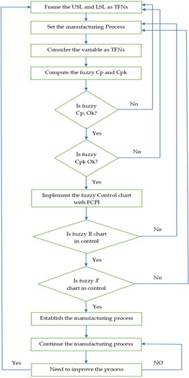 We adopted the Subramani and Balamurali [4] control chart and suggested a new fuzzy control chart. In this study, the aim is to build the control charts model for uncertain situations. We have provided fuzzy control charts for variables to make it easier for users to determine if the fuzzy process is under statistical control or not: that is, to decide whether the fuzzy process can continue without adjustment or, if necessary, to take corrective action to return the process to statistical control. The process can be allowed to proceed without modification or adjustment if the values of the fuzzy process capability indices are at a sufficient level. If not, appropriate adjustments must be made in order for the process to meet the needs of both fuzzy control charts and FPCI. The explanation of how a control chart and flow control chart work follows (Figure 2).
