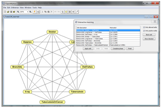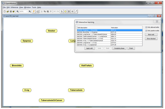 - Bermejo, I.; Oliva, J.; Díez, F.J.; Arias, M. Interactive learning of Bayesian networks with OpenMarkov. In Proceedings of the Sixth European Workshop on Probabilistic Graphical Models (PGM’12), Granada, Spain, 19–21 September 2012; pp. 27–34. [Google Scholar]