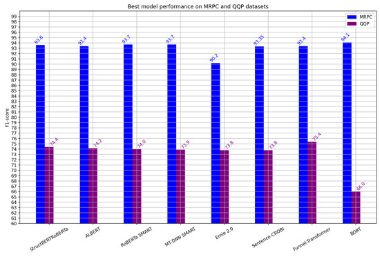 Figure 2 displays a bar chart showing each model’s best performance on the Microsoft Research Paraphrase Corpus and Quora Question Pair dataset. We obtain these performance metrics from the GLUE Benchmark leaderboard for the state-of-the-art models. The Sentence-CROBI model corresponds to the ensemble learning technique described above in the case of MRPC and a single fine-tuning approach for the QQP dataset. All models achieve a higher F1-score than 90 in MRPC. However, in the QQP dataset, only the BORT model obtained an F1-score lower than 70. The difference in the BORT model’s performance on both datasets suggests instability in its fine-tuning algorithm because of the model’s size.