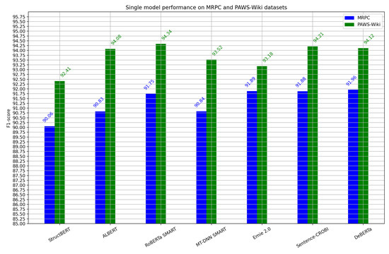 Figure 3 displays a bar chart showing each model’s average performance over five runs using different random seeds on the Microsoft Research Paraphrase Corpus and PAWS-Wiki corpus. The configuration for all the models is a single fine-tuning approach, without any intermediate task or ensemble learning technique. BORT and Funnel-Transformer do not appear in this chart because there is no public implementation. The Sentence-CROBI architecture is 0.56 above the average in F1-score for MRPC, which is 91.31. In the same corpus, 4 of 7 models, our approach included, have performance higher than 91. Meanwhile, the average F1-score for the PAWS-Wiki dataset is 93.69, and our proposed model achieves a value 0.51 above this. Similar to MRPC, our model is one of the four models with an F1-score higher than 94.