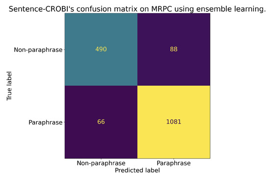 Sentence-CROBI’s confusion matrix on the Microsoft Research Paraphrase Corpus using an intermediate-task fine-tuning approach and ensemble learning.