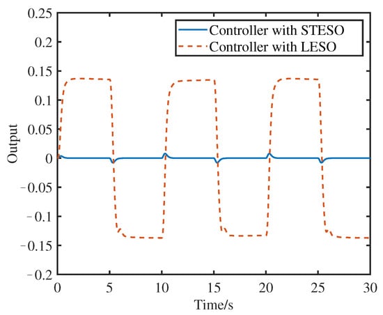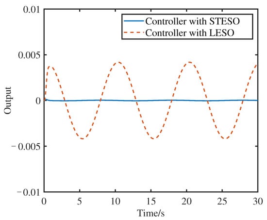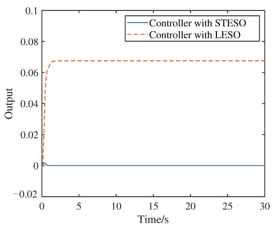 The parameters of the LESO-based controller is also selected as that in (44). The task of the controller is to stabilize system (43) to its origin. The collected simulation results are shown in Figure 1 and Figure 2. Note that this article focuses on the disturbance estimation and compensation problem of STESO, then the analysis of the input is omitted for simplicity. Specifically, when the stable state is achieved, the input of u is the value of the nonlinear term of the controlled model. It can be seen from Figure 1 that the closed-loop system with the proposed method maintains zero tracking error within 1 s, while the output of the system with LESO has a constant tracking error of 0.067. The maximum tracking error of the STESO-based controller is 0.0017, which is much smaller than the comparative one. It can be concluded from the comparison that the proposed method achieves better transient performance and maintains a lower tracking error.
