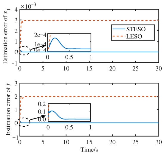 The estimation errors of the proposed and comparative observer are shown in Figure 2. As described in Section 2, the LESO is not able to handle the ramp disturbance. It is seen from Figure 2 that the estimation errors are not attenuated with time. The maximum estimation error of of STESO is about at 0.16 s, while that of the comparative method is about , which is 20 times greater than the proposed one. The estimation error of f, the total disturbance, shares the same situation. The maximum estimation errors of STESO and LESO for f are 0.1 and 2, respectively. It can be inferred from the comparison that the proposed observer achieves better performance with less settling time and zero estimation error than the LESO.