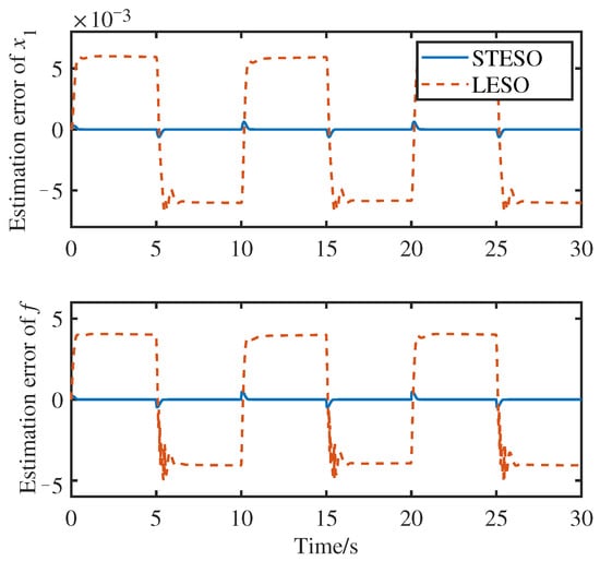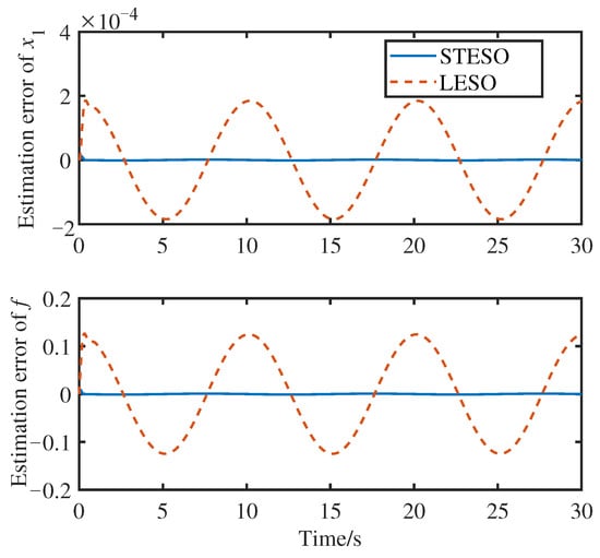 The simulation results of the extended observers are shown in Figure 6, which are utilized to verify the robustness and stability of the proposed STESO. As we can see, the estimation errors share the same trend with the tracking error. The estimation error of of the proposed and comparative method are zero and , respectively. It can also be seen from Figure 6 that the estimation error of f of STESO and LESO are zero and , respectively. Therefore, it can be inferred from Figure 6 that the proposed observer can maintain zero estimation error for the given multiple disturbance and achieves better performance than the comparative one.