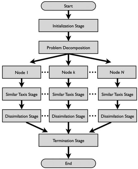 The algorithm is composed of three main stages: initialization of groups, similar taxis, and dissimilation. Operations of similar taxis and dissimilation are repeated iteratively, while the best obtained value of an objective function () changes. When the best obtained value stops changing, the winner of the best group among a set of leading groups is selected as a solution to the optimization problem [33].