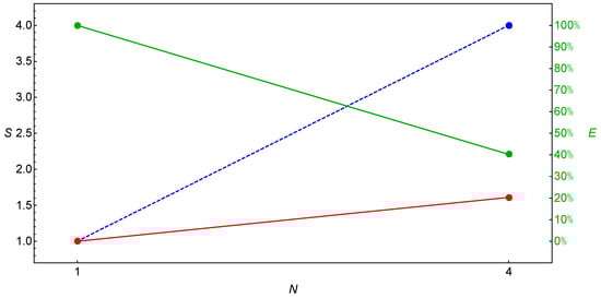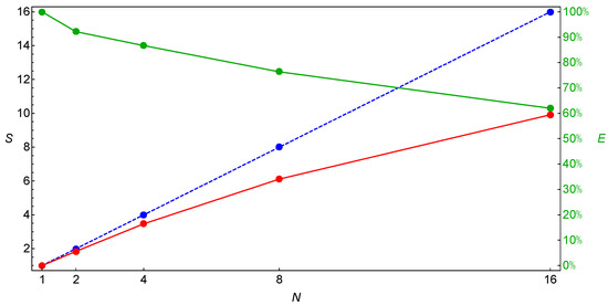 The speedup (S, red) and the efficiency (E, green) of the parallelization depending on the number of computing nodes (N) for the sPMEC algorithm; the maximum possible speedup is indicated by a blue dashed line.