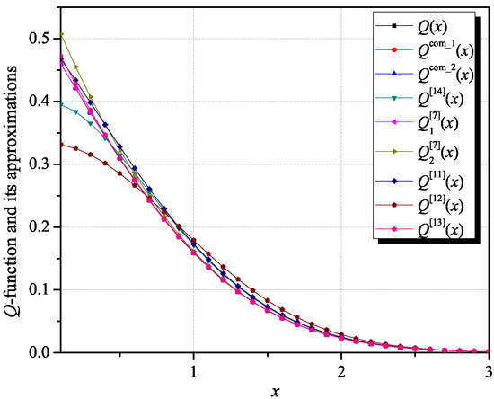 Figure 1 presents the comparison of the Q-function and its approximations, where along with the selected approximations of the Q-function from the literature [7,11,12,13,14], two novel approximations of the Q-function are presented as well. Although it is not very visible from Figure 1, we show below that the proposed composite approximation of the Q-function, specified for x = 1.3514, that is, for intervals determined from Lemma1 as [0, 1.3514) and [1.3514, ∞), outperforms in terms of accuracy the Q-function approximations used for comparison purposes. The results of approximating the Q-function for different values of x are presented in Table 2.