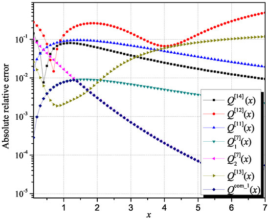 To point out an excellent match of the values of the ASEP for a BPSK modulation, calculated with the proposed composite approximations Q(x) and Q(x), and the exact ones, in Figure 4, we present the values for the absolute relative error of the BER for m = 2. By using Q(x) and Q(x), very tight approximations (lower values of the absolute error of BER) were obtained in a wide range of argument values compared to cases utilizing the Q-function approximations from the literature selected for comparison purposes and used for the ASEP values computation.